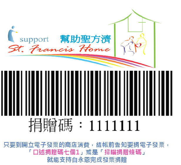 發票儲存於預設捐贈愛心碼1111111的載具 (例:手機條碼/信用卡/悠遊卡/i-cash/一卡通等),溫馨提醒請先至財政部電子發票整合服務平台網站,將載具(手機條碼/信用卡/悠遊卡/i-cash/一卡通)指定預設捐贈單位為白永恩神父基金會愛心碼1111111,儲存於載具內的發票會自動捐贈白永恩神父基金會。